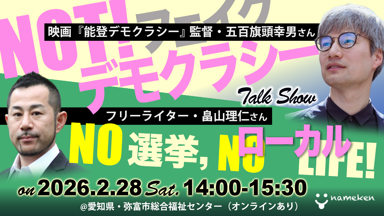 国政選挙が終わった今だからこそ、足元の地方政治を見つめ直す機会も。今月末にこんなイベントを開き、オンライン生配信もします。なメ研サポートメンバーへの登録を、よろしくお願いします。»『能登デモクラシー』監督・五百旗頭幸男さん✕フリーライター・畠山理仁さんトークショー「NOT!フェイクデモクラシー NO選挙, NO ローカル LIFE!」生配信(2026年2月28日14:00〜)(theLetter)